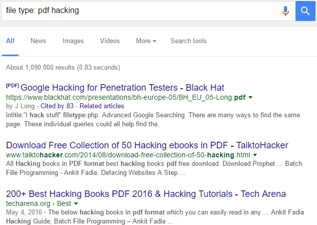 You can search only a specific type of file if you want. Like if you want to search only PDF file against a term you should write as: “filetype: pdf hacking”