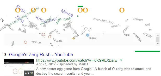 - #1: Zerg Rush. Search for ‘zerg rush’ and an army of Google O’s will start attacking and destroying the search results, and then take over the entire page. …