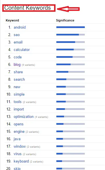 This Tool shows you the most used keywords on your site. They are shown to you by significance. So, from here you can get ideas about keywords and you can also download the whole chart.