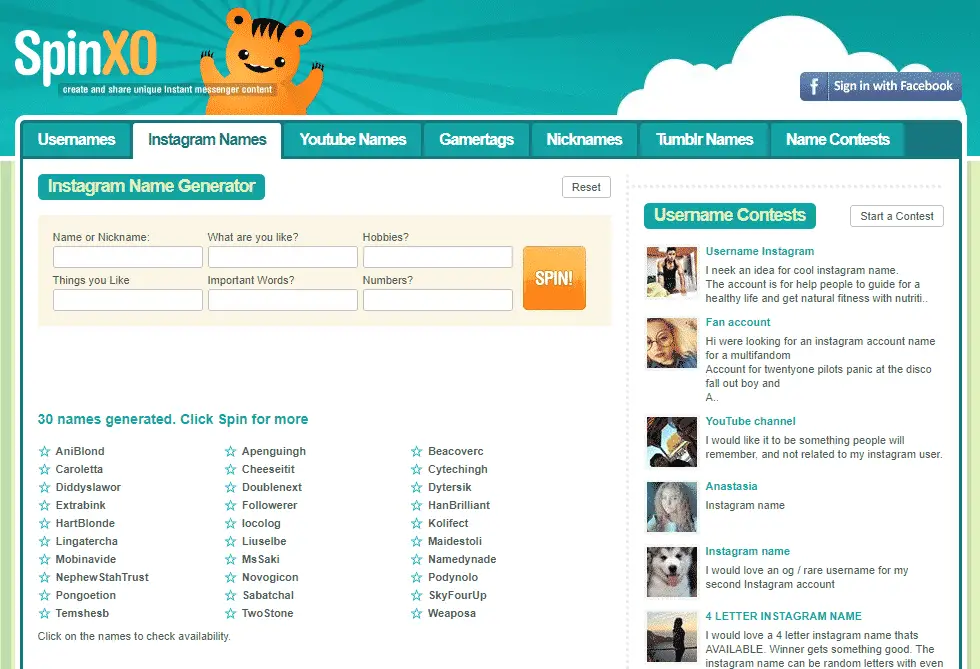 You will see that using the interface of spin-xo is interesting and also gives you multiple choice and opinions based on your name. You can choose your own nickname, words, hobbies, or numbers you like and spin it into something greater.