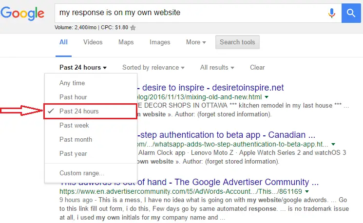 Click on Search Tools and then change the results from Any Time to Past 24 Hours. Have a look at the screenshot below: