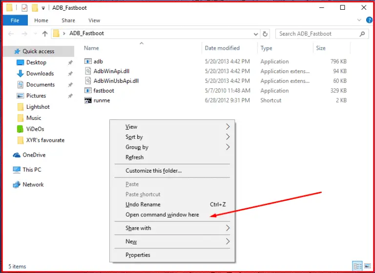 • Press & Hold Right Shift button from your keyboard then Right-click anywhere in Fastboot and Open Command Window.