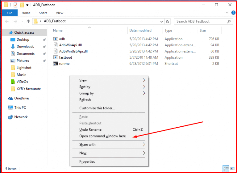 - Press & Hold Right Shift button from your keyboard then Right-click anywhere in Fastboot and Open Command Window.