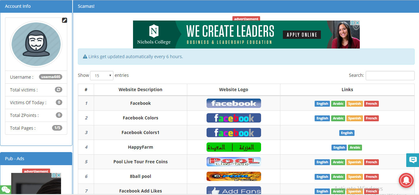 Total pages are those pages in z shadow that you have created by yourself. You can make a phishing page of any site you want but it may not work for some site. And another limitation is that you can only make five custom pages.